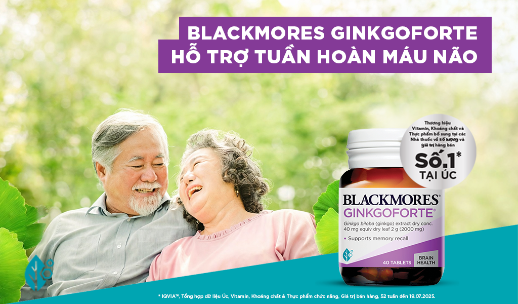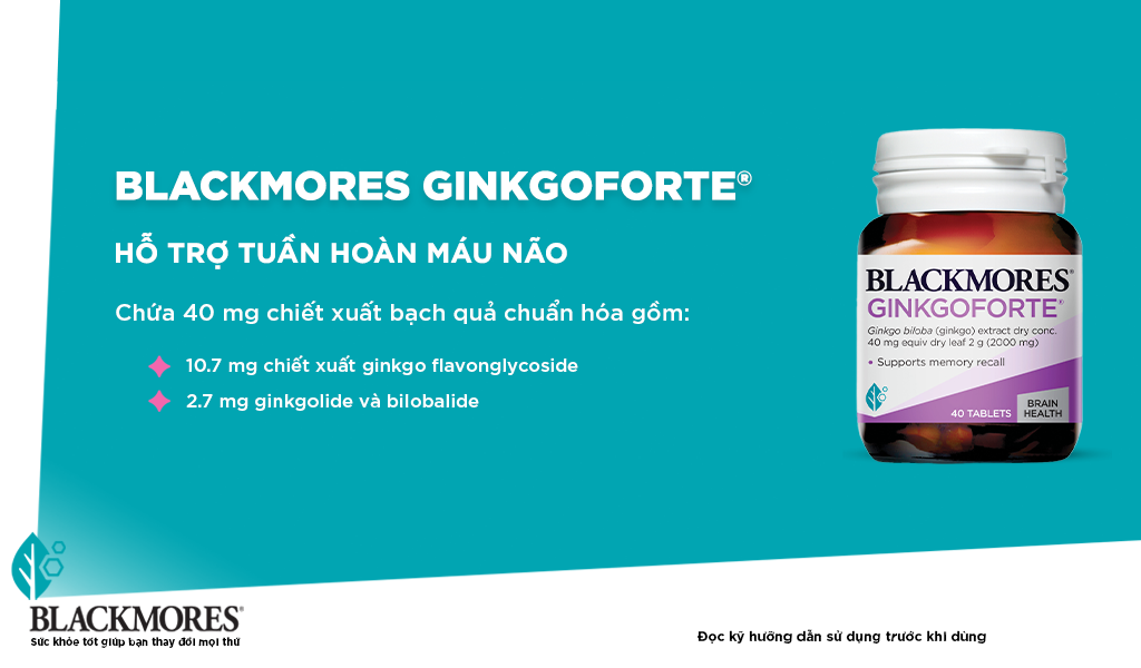Blackmores Ginkgoforte với chiết xuất bạch quả chuẩn hóa (ginkgo biloba) (40mg) chứa 10.7mg ginkgo flavonglycosides và 2.7mg ginkgolides và bilobalide, hỗ trợ tuần hoàn máu não